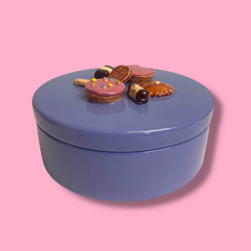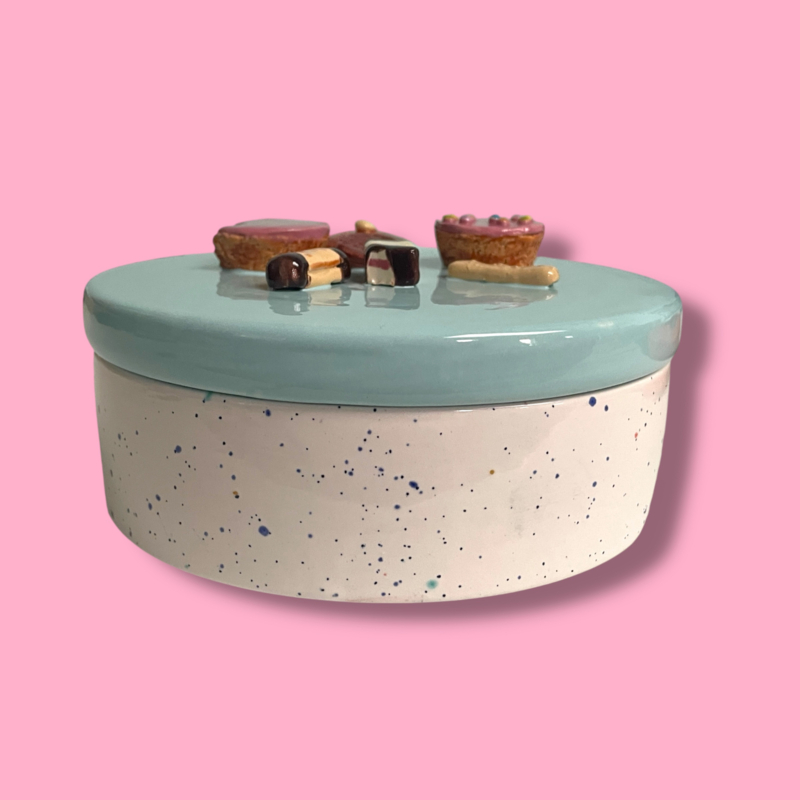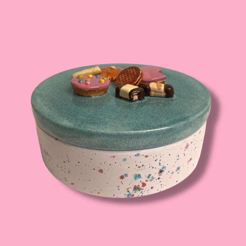 Is ie niet fantastisch? De koekjes koektrommel! Je hebt de keuze uit roze/confetti, lichtblauw/ confetti, glitter/confetti, paars, oranje/groen en blauwe stippen.